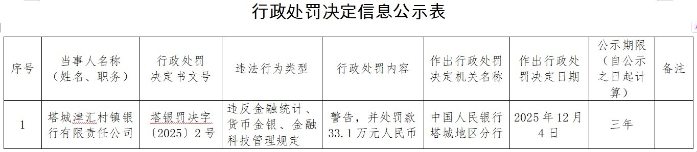 中国经济网北京12月16日讯 中国人民银行新疆维吾尔自治区分行网站12日发布中国人民银行塔城地区分行行政处罚决定信息公示表(塔银罚决字〔2025〕2号)。塔城津汇村镇银行有限责任公司违反金融统计、货币金银、金融科技管理规定。中国人民银行塔城地区分行决定对其处以警告昆明配资公司,并处罚款33.1万元人民币。